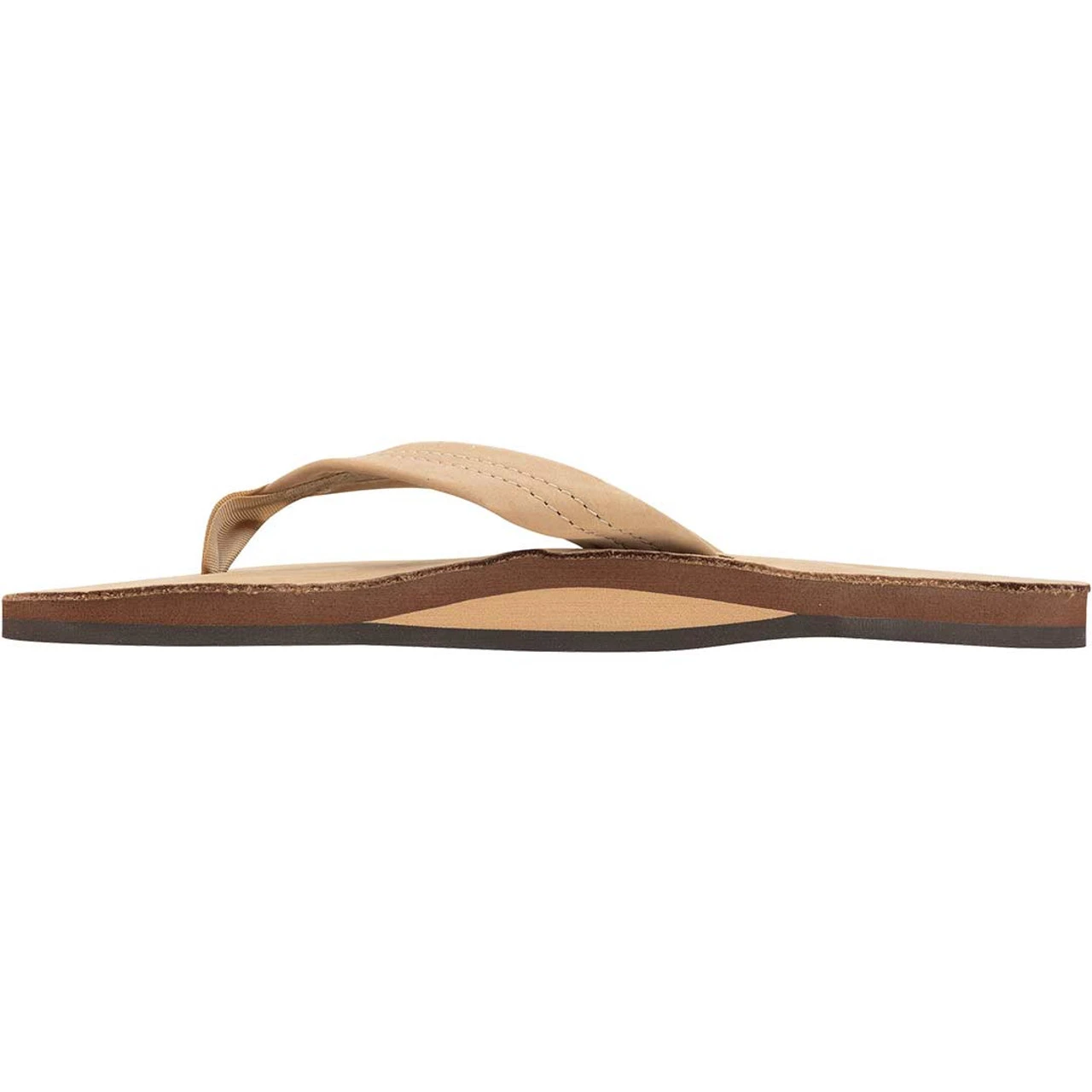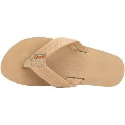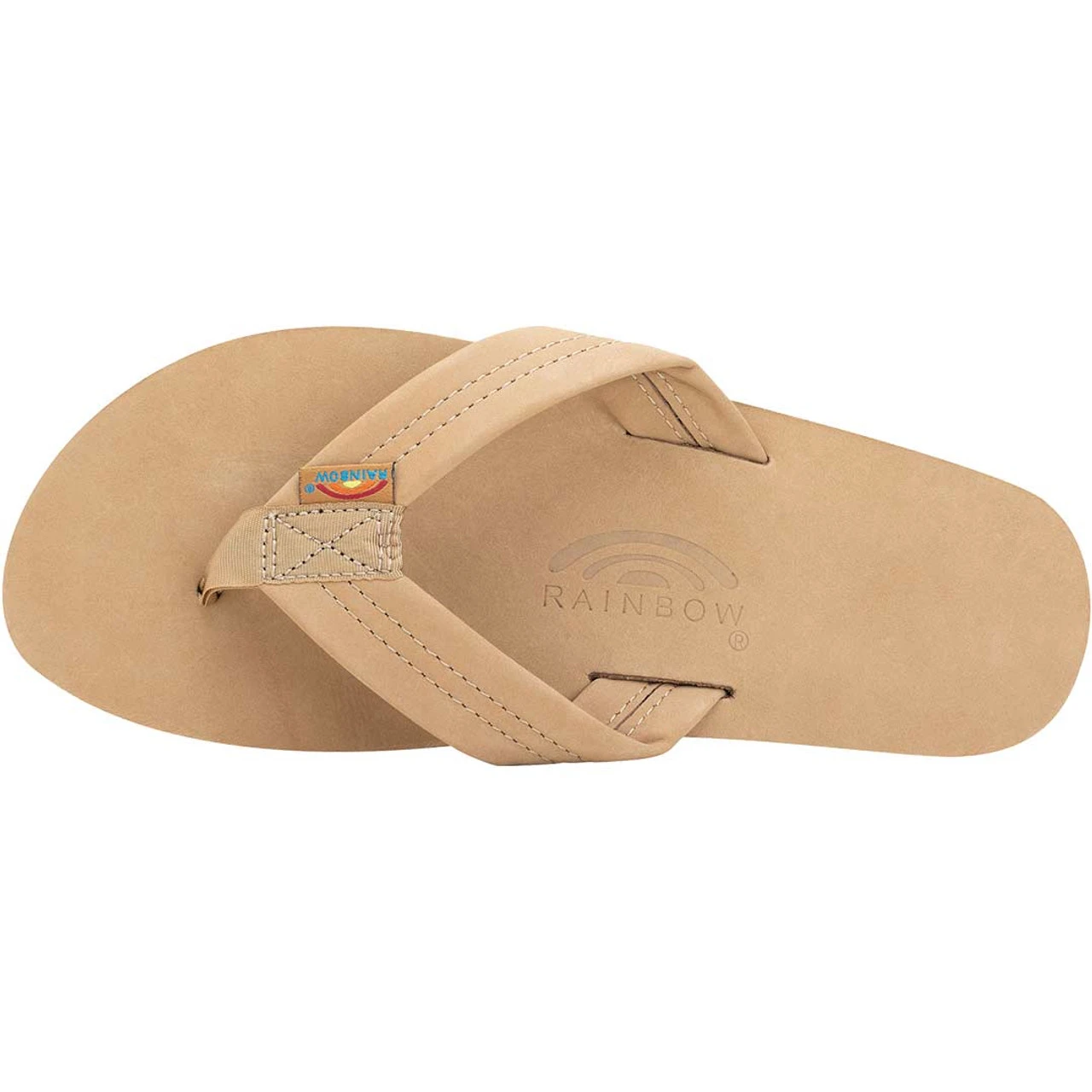 The single layer premier leather sandal is made with top grade nubuck leather; the top sole is embossed with the Rainbow® logo. The strap, also nubuck leather; is double stitched, and the nylon toe piece is secured with a box X stitch, all using bonded nylon thread.